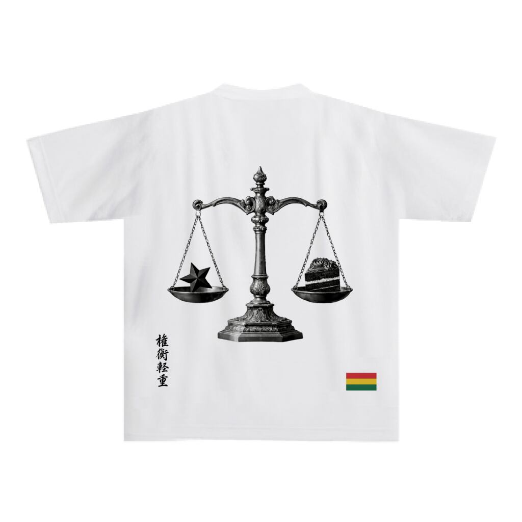 Jin Yeboahの遺伝的ルーツであるガーナの国旗からは、意図的に中央のBlack Starが省かれており、分銅として天秤の左皿に据えられている。